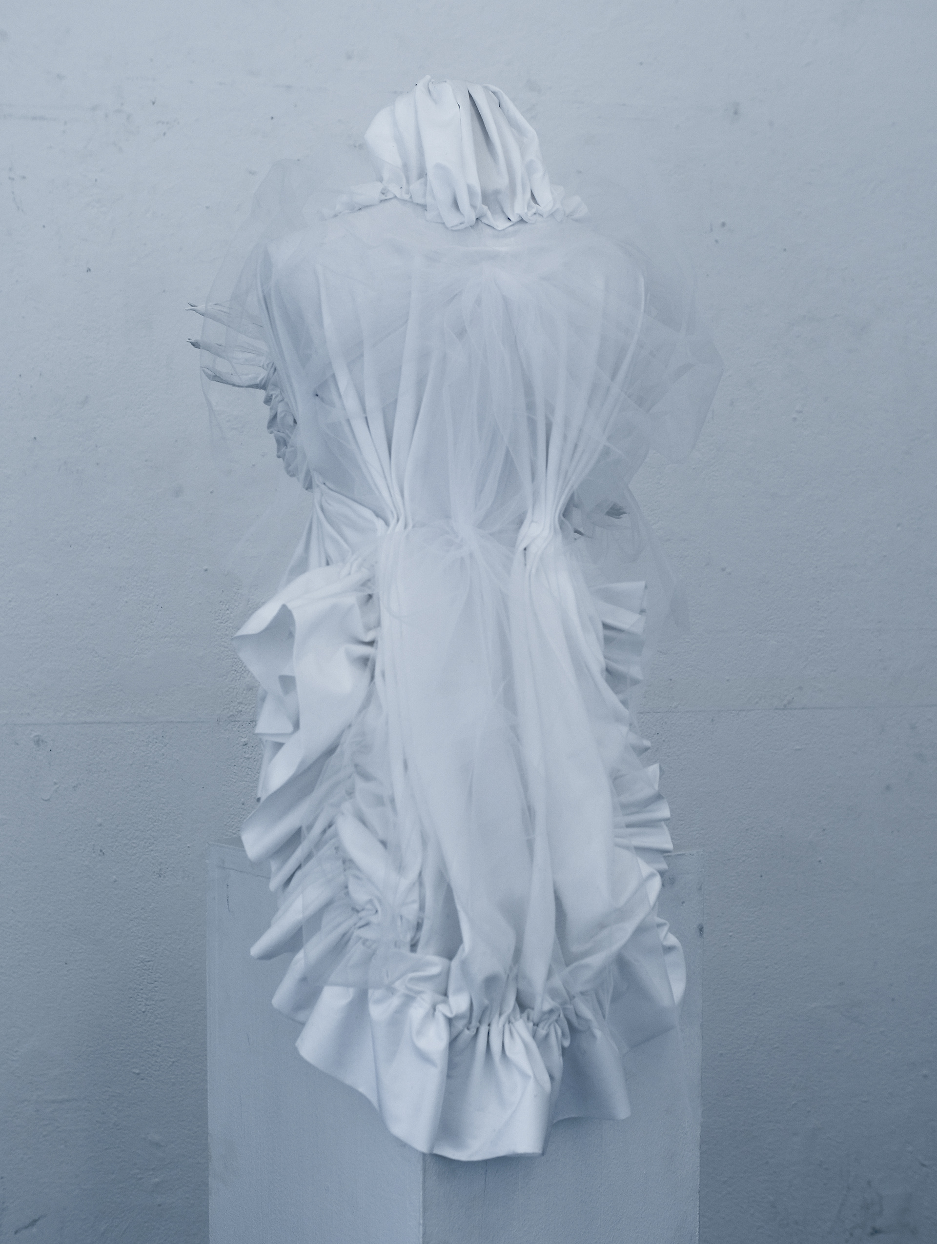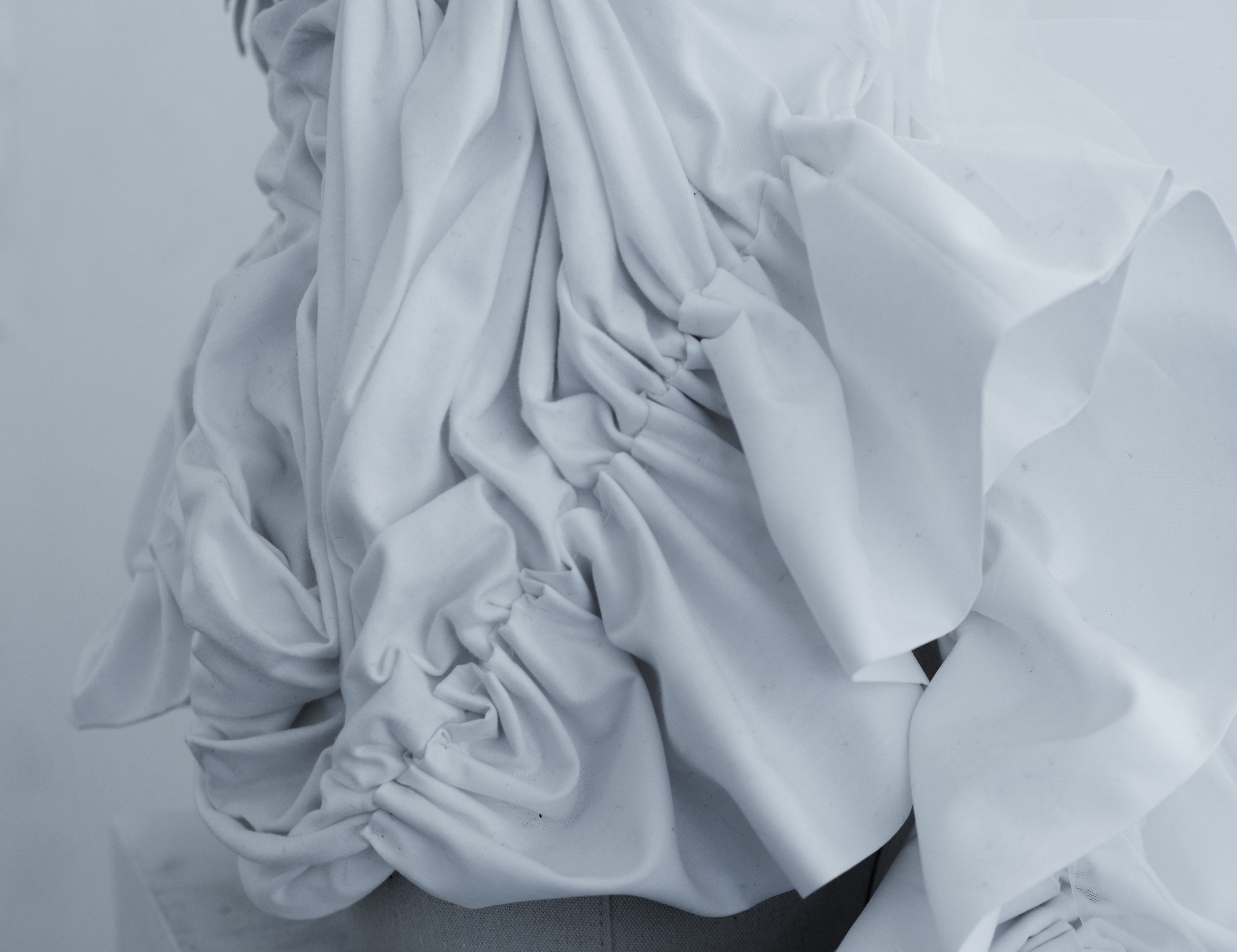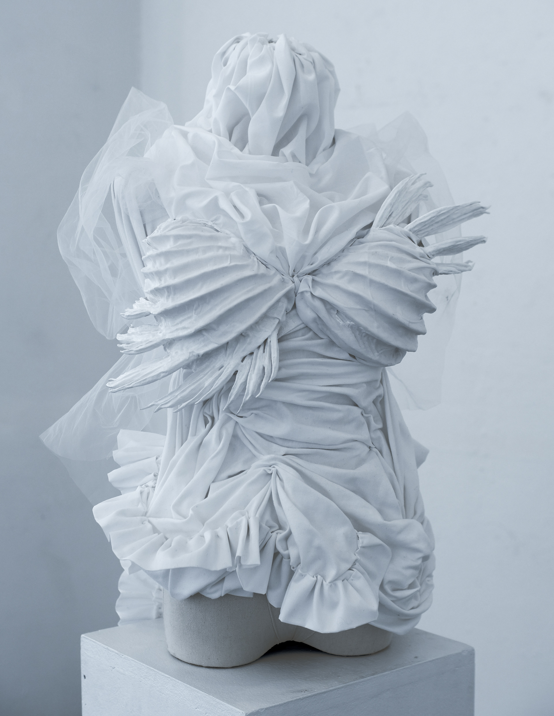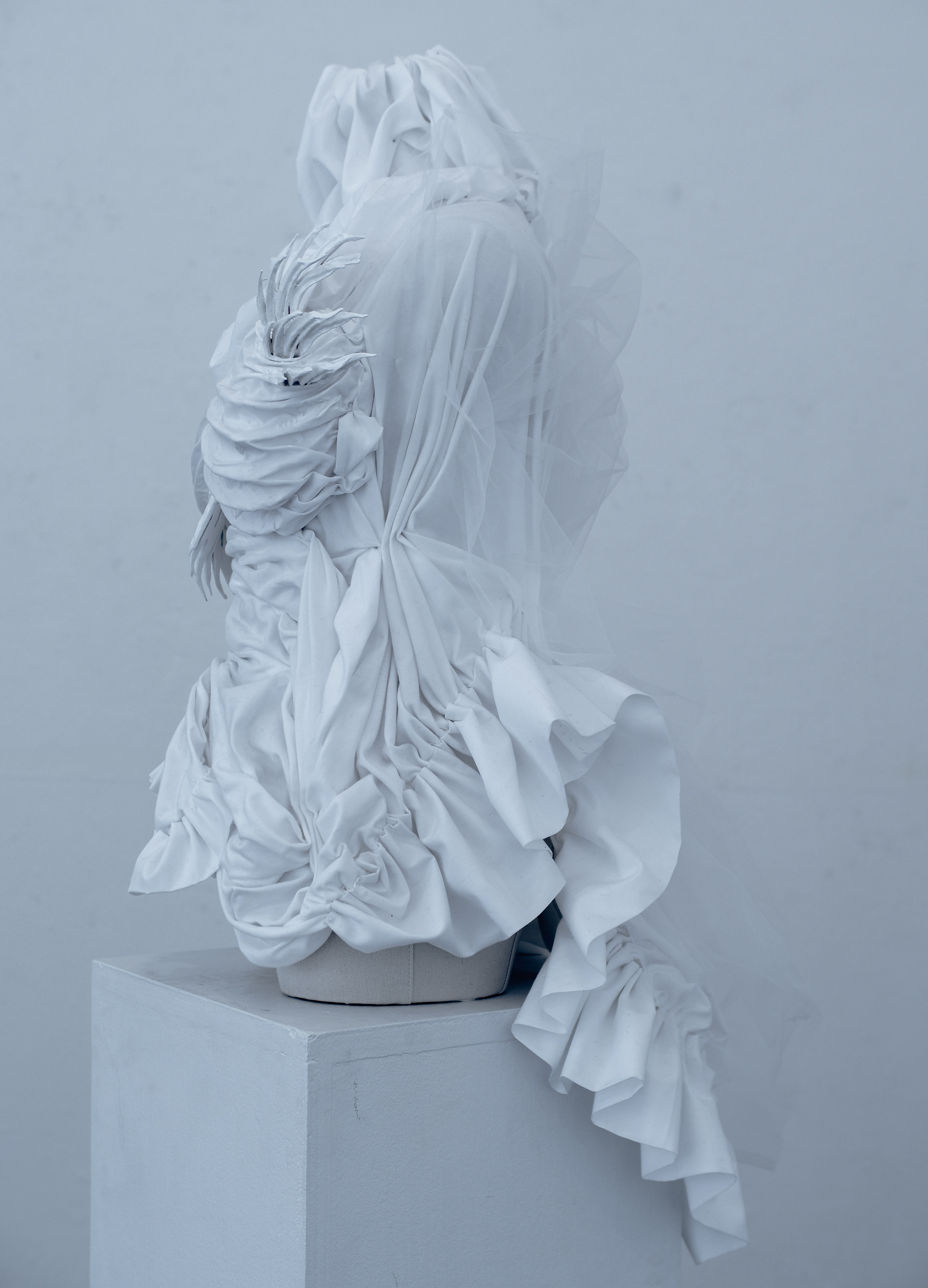 3D-printed breast cup, white acrylic paint, fabric (three textures), spray paint
