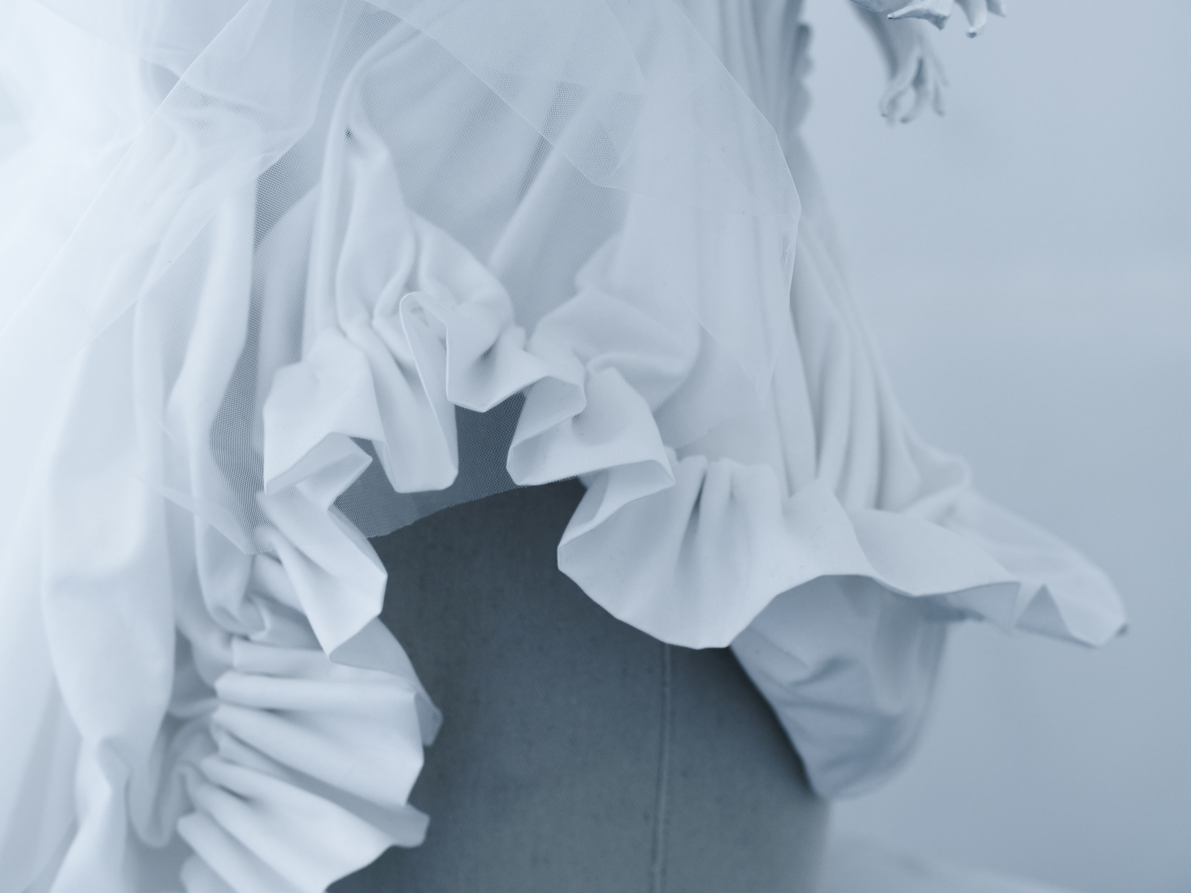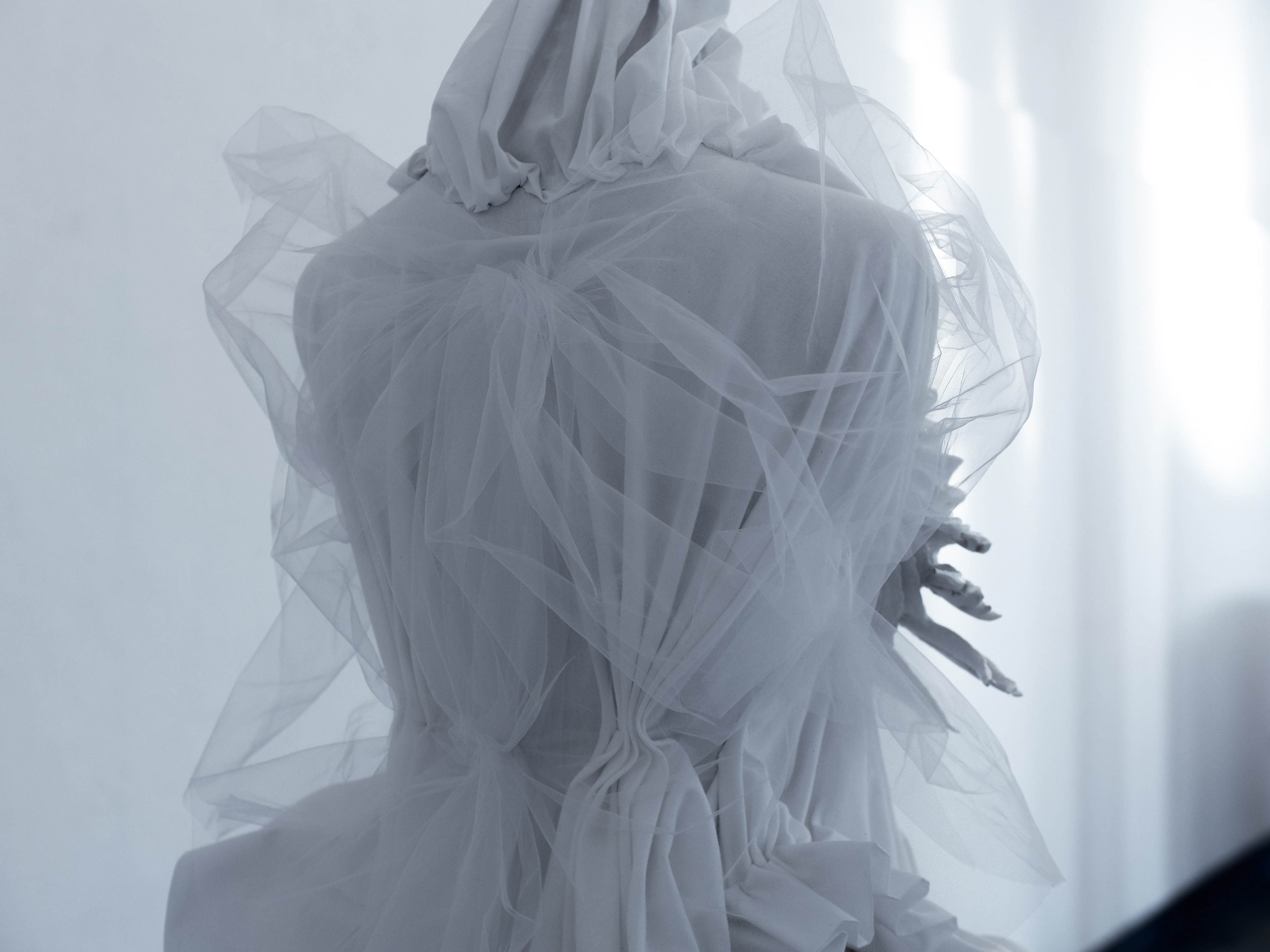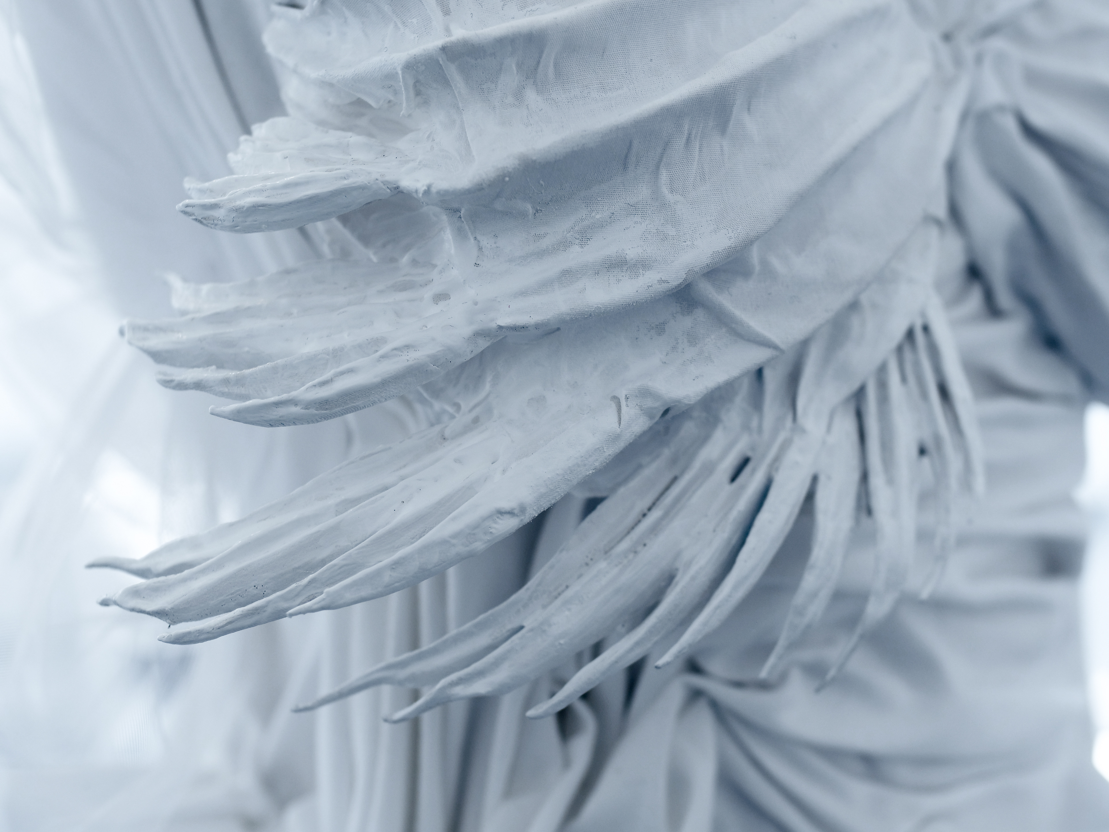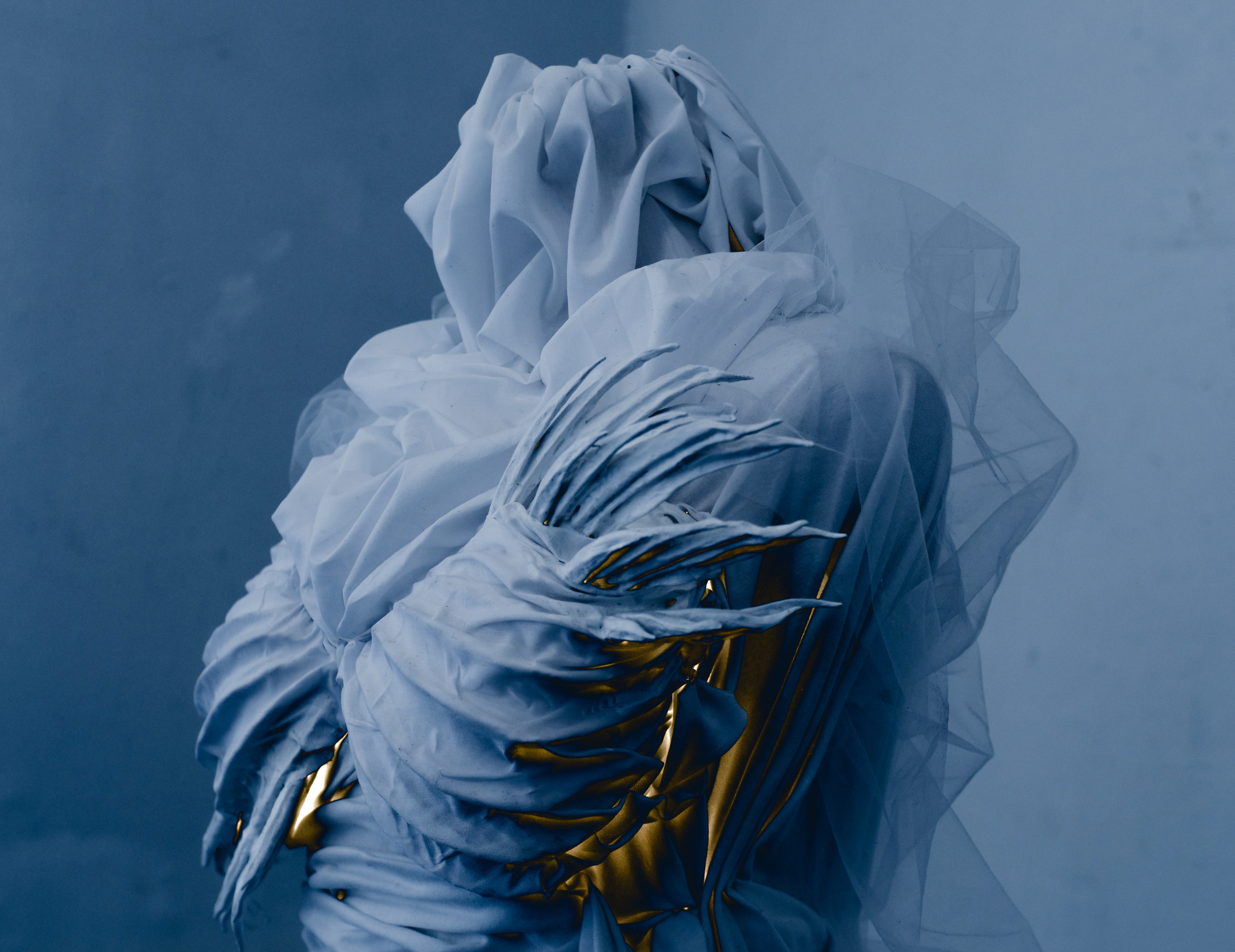 3D-printed breast cup, white acrylic paint, fabric (three textures), spray paint