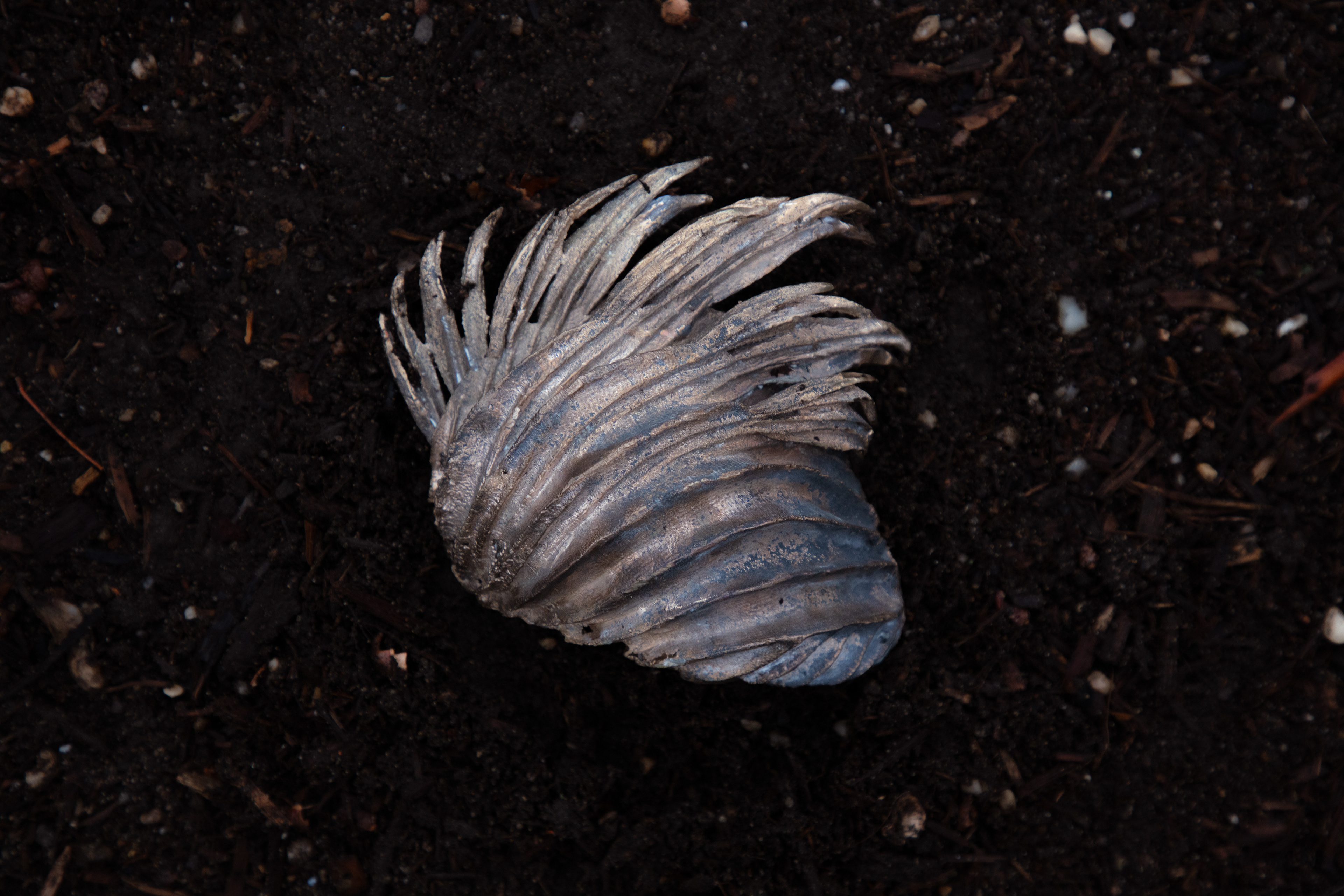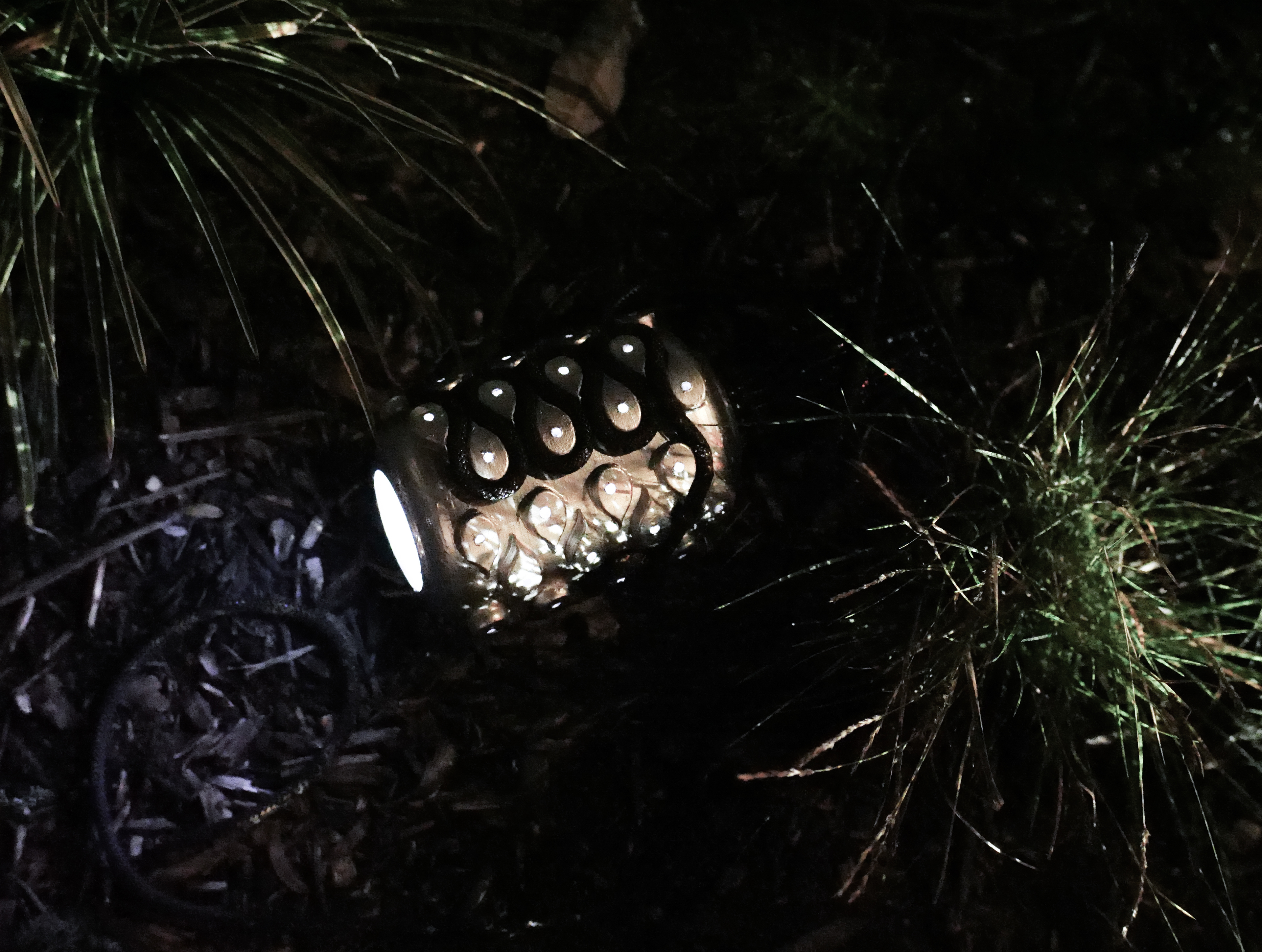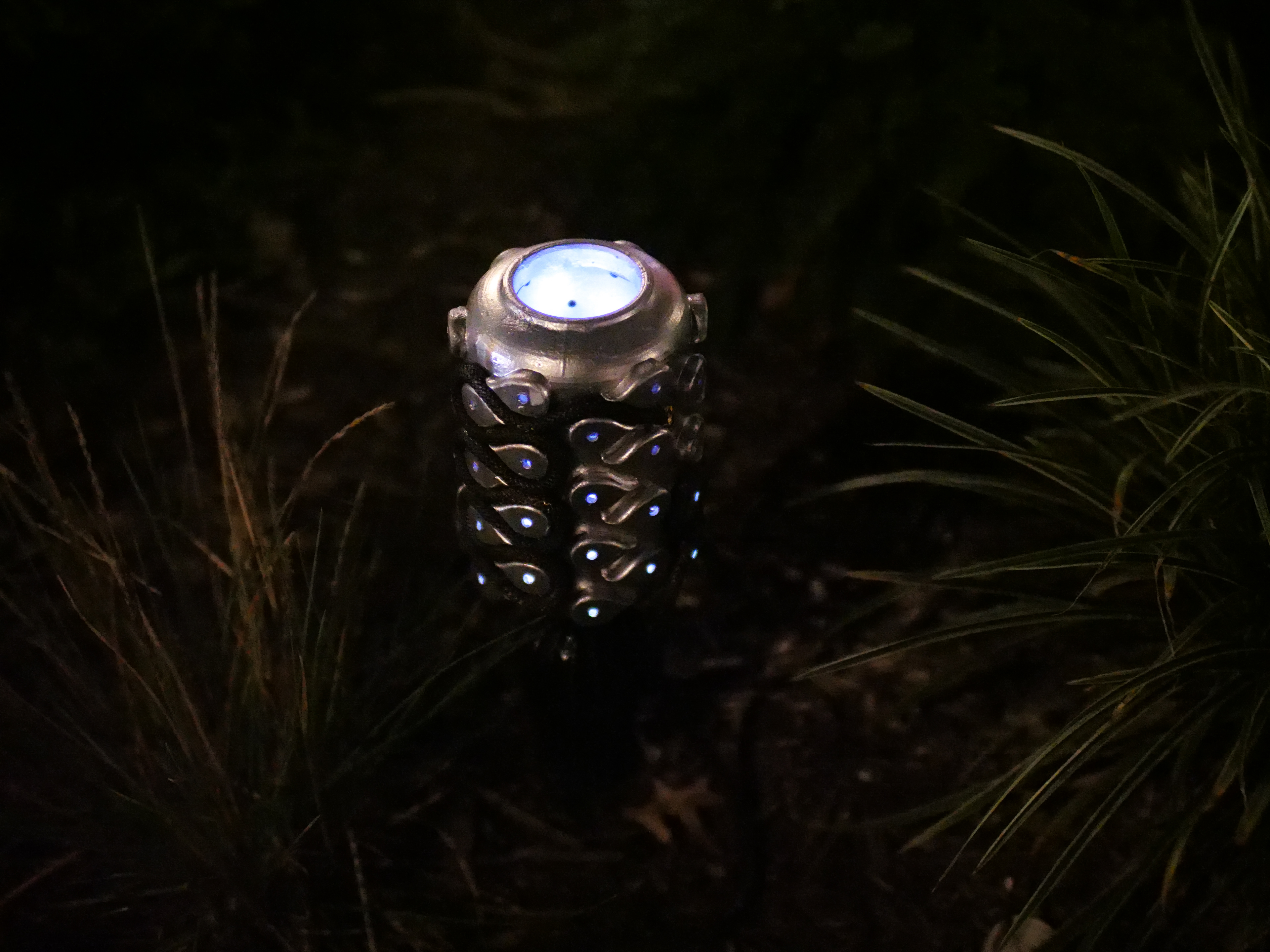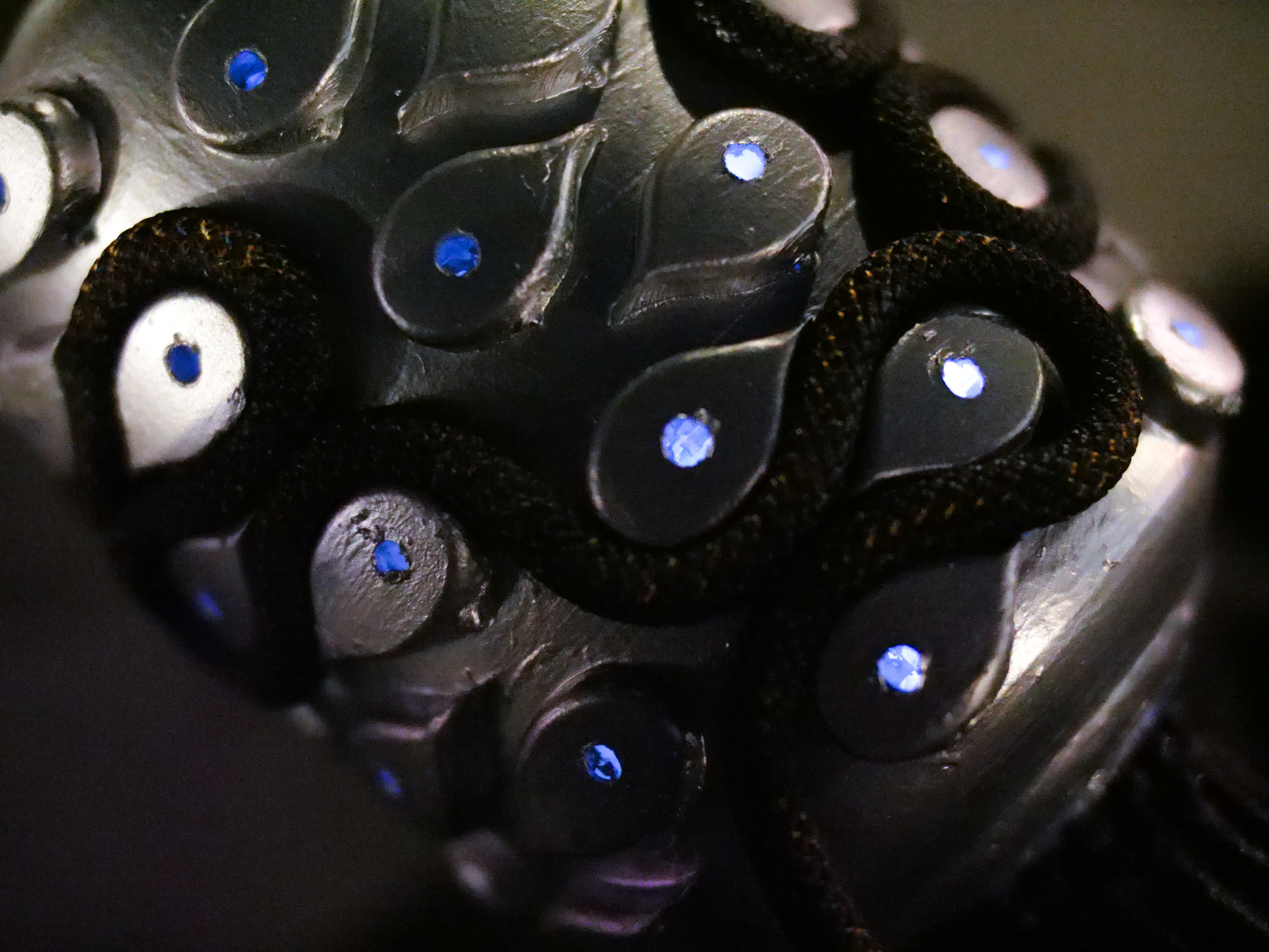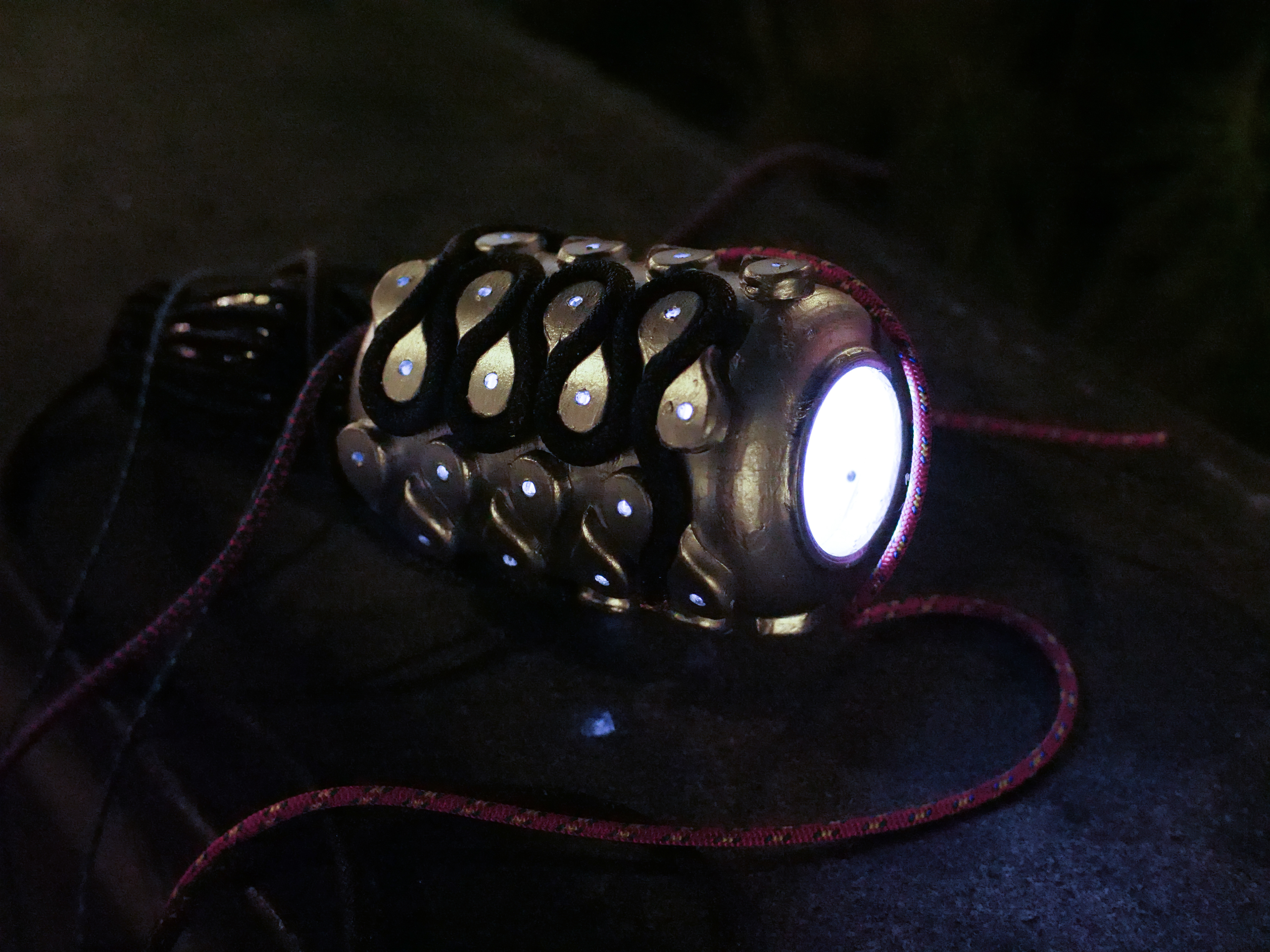 3D-printed resin, climbing ropes, metallic and black spray paint, micro LEDs.
